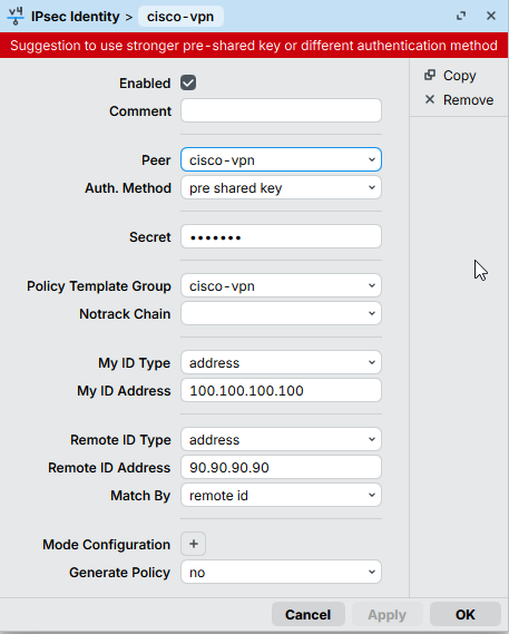 add my-id=address:100.100.100.100 peer=cisco-vpn policy-template-group=\