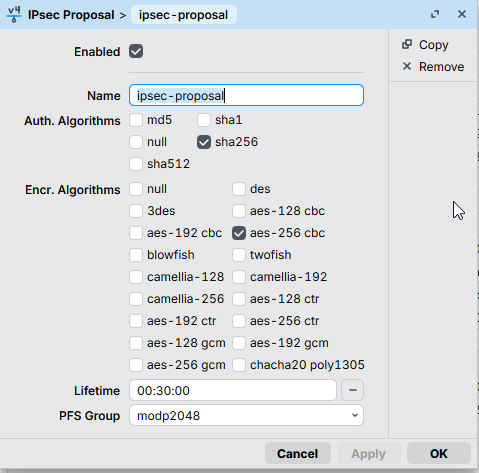 add dh-group=modp2048 enc-algorithm=aes-256 hash-algorithm=sha256 name=\