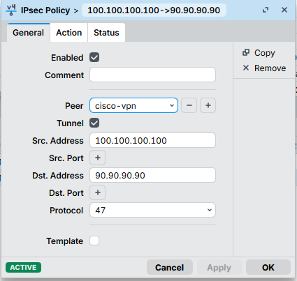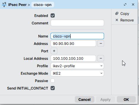 add dst-address=90.90.90.90/32 peer=cisco-vpn proposal=ipsec-proposal \