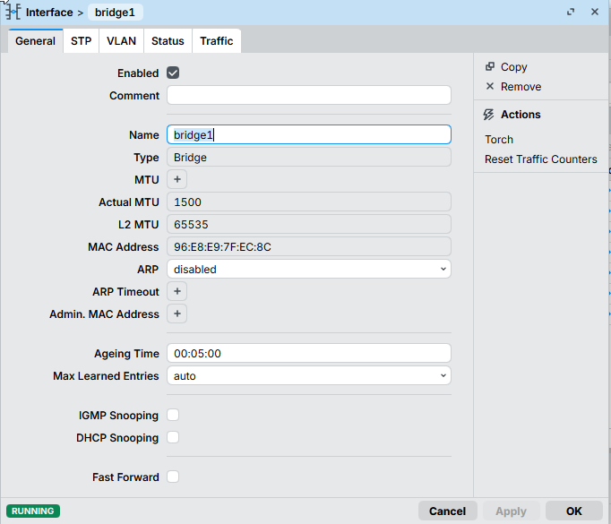 add arp=disabled fast-forward=no name=bridge1
