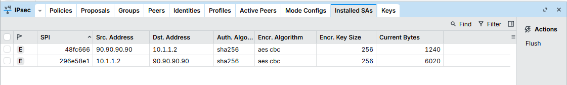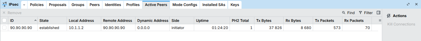 As the Mikrotik device is behind a NAT, the local IPSEC security association looks like this: