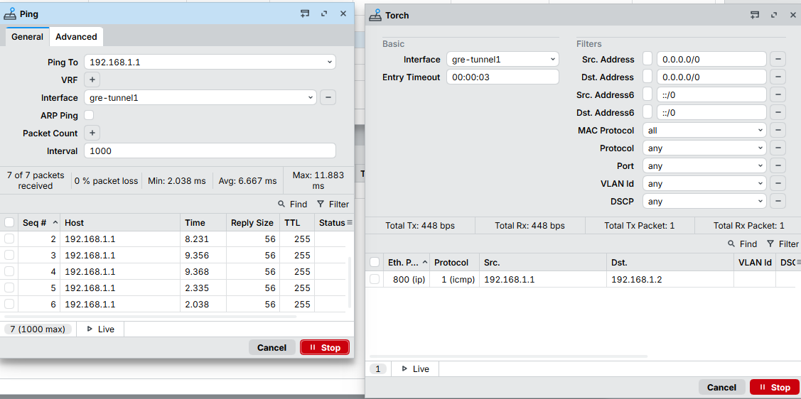 add address=192.168.1.2/30 interface=gre-tunnel1 network=192.168.1.0Here we are assigning IP addresses to the corresponding interfaces.